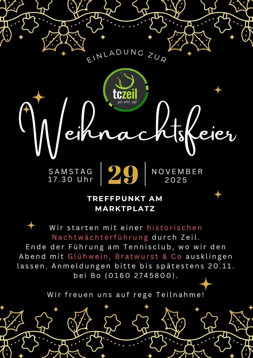 wir laden Euch herzlich zur Weihnachtsfeier mit historischer Nachtwächterführung durch Zeil ein. Die Führung endet beim TC. Anschließend lassen wir den Abend gemeinsam bei Glühwein, Bratwurst & Co. gemütlich ausklingen.