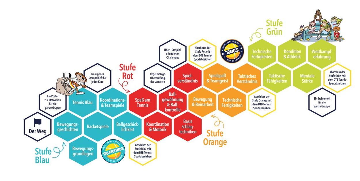 - Für den Abschluss einer Stufe und somit den Übergang in die nächste Stufe empfehlen wir das jeweilige DTB Tennis-Sportabzeichen in der Gruppe umzusetzen.